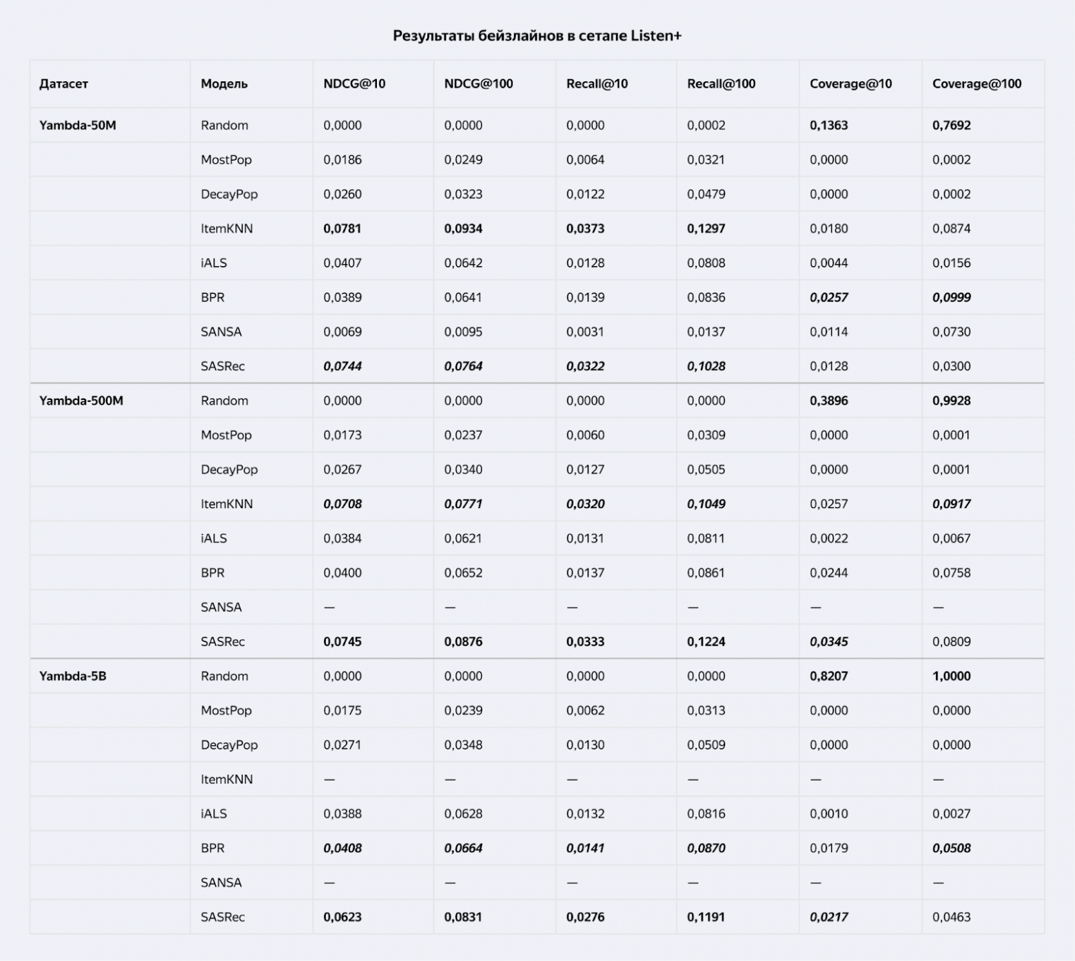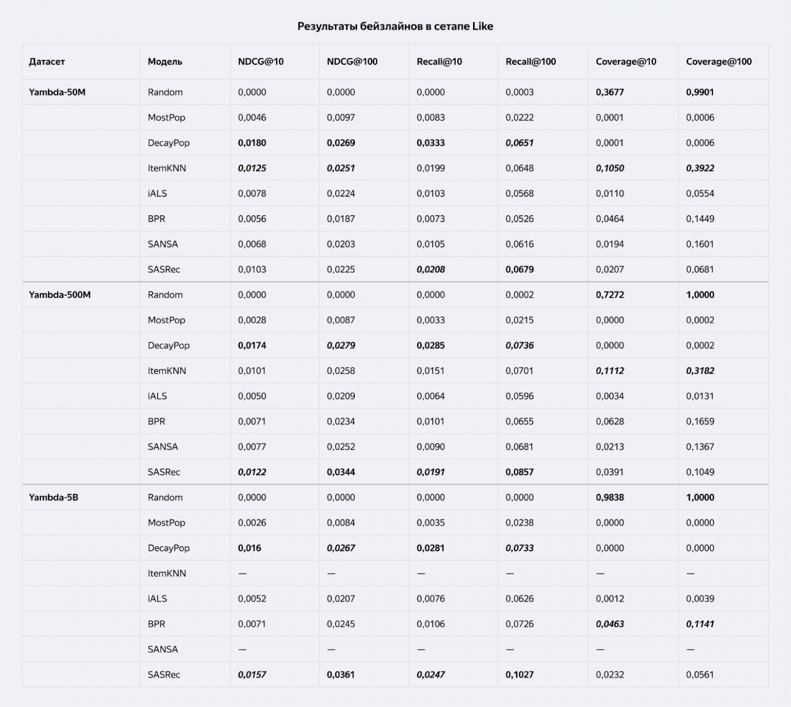 Мы протестировали несколько популярных рекомендательных алгоритмов на Yambda, чтобы предоставить бейзлайны для будущих исследований и сравнений. Мы выбрали MostPop, DecayPop, ItemKNN, iALS, BPR, SANSA, SASRec. В качестве метрик мы использовали следующие:
