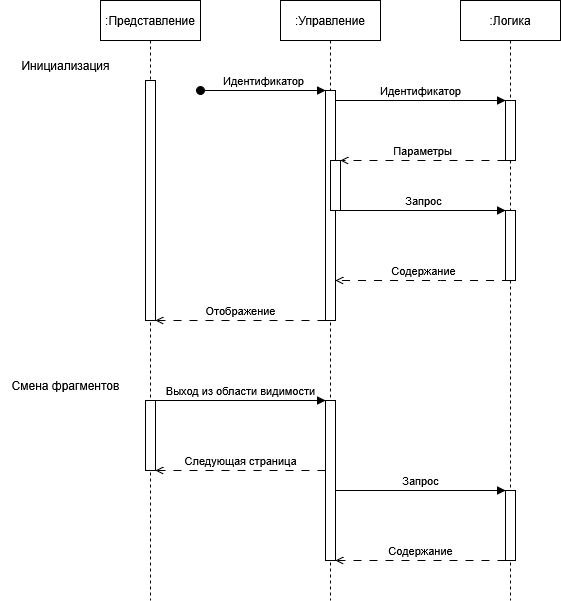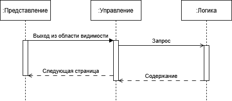 Мы же продолжим рассмотрение диаграммы последовательностей, её второй части. Слой представления в момент, когда фрагмент текста выходит из области видимости, сообщает об этом слою управления. Из очереди фрагментов извлекается очередной и передается представлению. В дальнейшем, слой управления запрашивает новый фрагмент для восстановления длинны очереди.