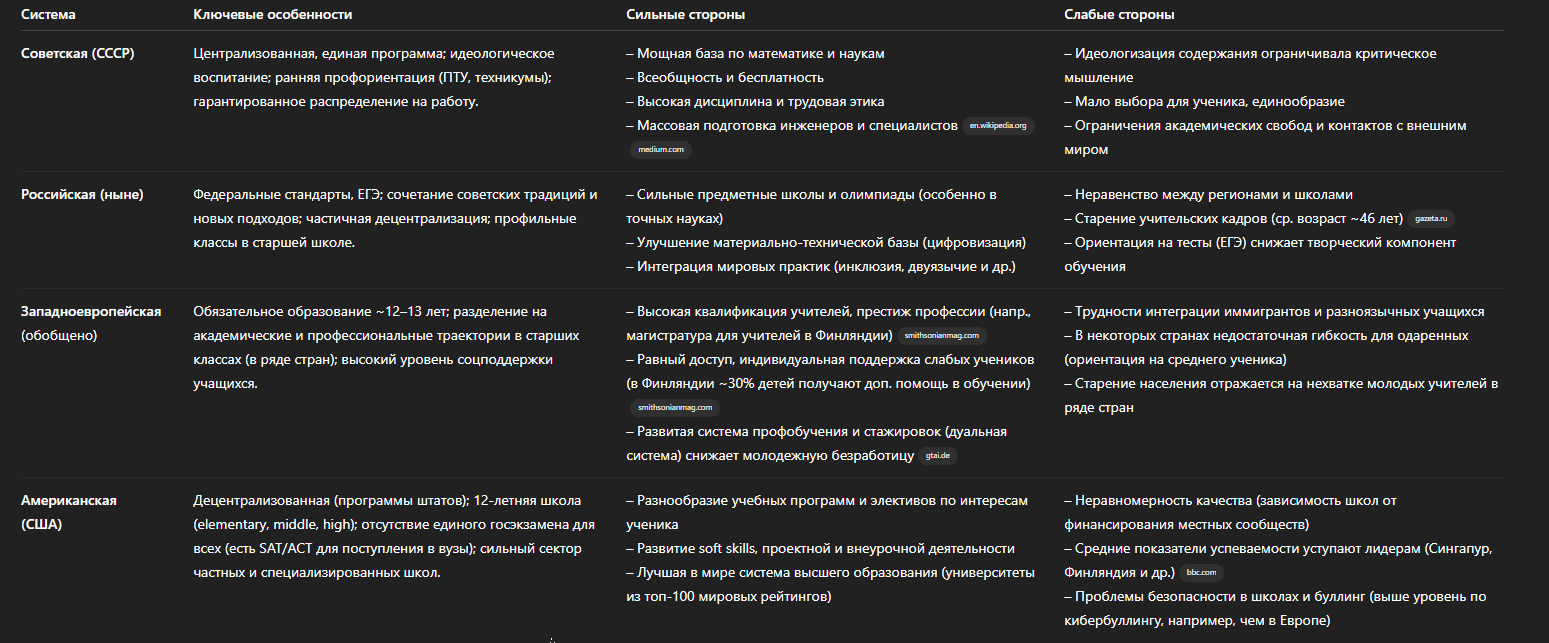 Советская система образования, несмотря на распад СССР, остается важным ориентиром при анализе современных моделей. Рассмотрим ключевые особенности и показатели советской модели в сравнении с сегодняшней российской системой, а также с типичными системами развитых стран Западной Европы и США.