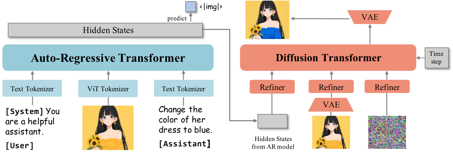 Уникальной особенностью OmniGen 2 является то, что она использует функции VAE (вариационного автокодировщика) исключительно в качестве входных данных для диффузионного декодера, а не интегрирует их в основную языковую модель. Такой подход упрощает архитектуру и помогает сохранить базовое понимание языка моделью.