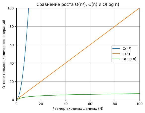 Как видно из примера выше при увеличении размера входных данных в 10 раз время растет также примерно в 10 раз. Отклонения дают кэш, работа ОС и другие накладные расходы интерпретатора, но тренд остается линейным. Именно это мы называем O(n)