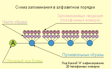В простейшем случае запоминание в порядке букв алфавита осуществляется также как и запоминание под порядковыми номерами. Однако букв в алфавите мало и можно запомнить последовательно всего 30 единиц информации.