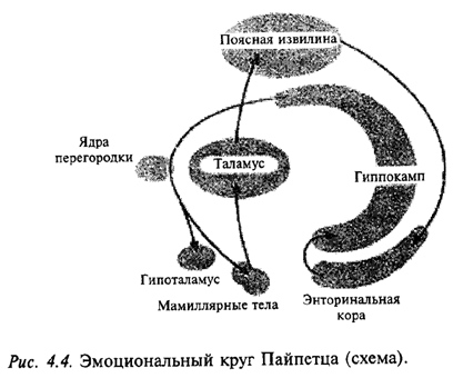 Многочисленные клинические наблюдения, а также исследования на животных показали, что в проявлении эмоций ведущую роль играют структуры круга Пайпетца (рис. 4.4). Американский нейроанатом Пайпетц (1937) описал цепочку взаимосвязанных нервных структур в составе лимбической системы. Эти структуры обеспечивают возникновение и протекание эмоций. Он обратил особое внимание на существование многочисленных связей между структурами лимбической системы и гипоталамусом. Повреждение одной из структур этого «круга» приводит к глубоким изменениям в эмоциональной сфере психики.