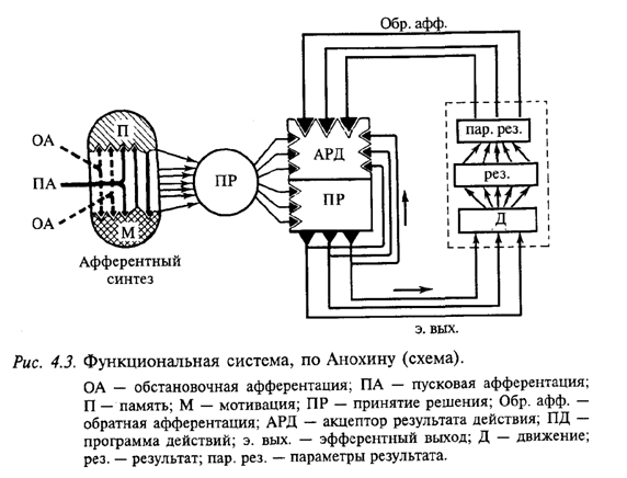 Лимбическая система в мозге человека выполняет очень важную функцию, которая называется мотивационно-эмоциональной. Чтобы было ясно, что это за функция, вспомним: каждый организм, включая организм человека, имеет целый набор биологических потребностей. К ним, например, относятся потребность в пище, воде, тепле, размножении и многое другое. Для достижения какой-то определенной биологической потребности в организме складывается функциональная система (рис. 4.3). Ведущим системообразующим фактором является достижение определенного результата, соответствующего потребностям организма в данный момент. Начальным узловым механизмом функциональной системы является афферентный синтез (левая часть схемы на рис. 4.3). Афферентный синтез включает доминирующую мотивацию (например, пищевую-поиск пищи и ее потребление), обстановочную афферентацию (событий внешней и внутренней среды), пусковую афферентацию и память. Память необходима для реализации биологической потребности. Например, щенка, которого только отняли от соска, невозможно накормить мясом потому, что он не воспринимает его как пищу. Только через некоторое количество проб (запоминается вид пищи, ее запах и вкус, обстановка и многое другое) щенок начинает употреблять в пищу мясо. Интеграция этих компонентов приводит к принятию решения. Последнее, в свою очередь, связано с определенной программой действия, параллельно с ней формируется также акцептор результатов действия, т.е. нервная модель будущих результатов. Информация о параметрах результата через обратную связь поступает в акцептор действия для сопоставления с ранее сформированной моделью. Если параметры результата не соответствуют модели, то здесь возникает возбуждение, которое через ретикулярную формацию мозгового ствола активирует ориентировочную реакцию, и происходит коррекция программы действия. Примеры некоторых биологических мотиваций будут приведены ниже.