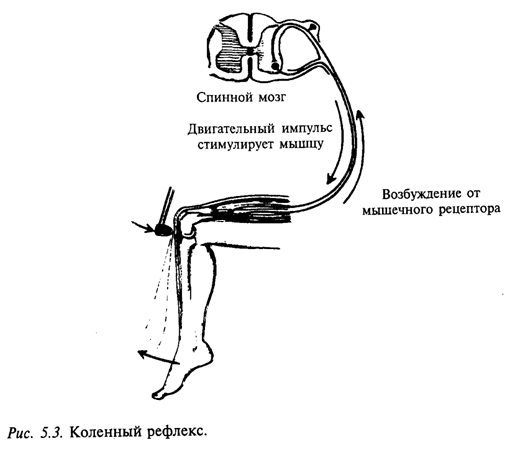 Один из таких примеров – рефлекс на растяжение. Примером такого рефлекса может служить коленный рефлекс, который возникает при легком ударе по сухожилию мышцы в подколенной чашечке (рис. 5.3). Рефлекс на растяжение предотвращает чрезмерное растяжение мышцы, которая как бы сопротивляется растягиванию. Этот рефлекс возникает как ответная реакция мышцы на стимуляцию ее рецепторов, поэтому его часто обозначают как собственный рефлекс мышцы.