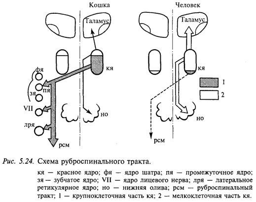 Кортико-руброспинальная система двигательного контроля. От красного ядра, которое залегает в толще среднего мозга, берет начало руброспинальный путь. Моторная область коры, откуда берет начало пирамидный тракт, проецируется ипсилатерально на задние 2/3 красного ядра. Сенсомоторная кора (у кошки задняя часть сигмовидной извилины) проецируется ипсилатерально на переднюю область мелкоклеточной части красного ядра.