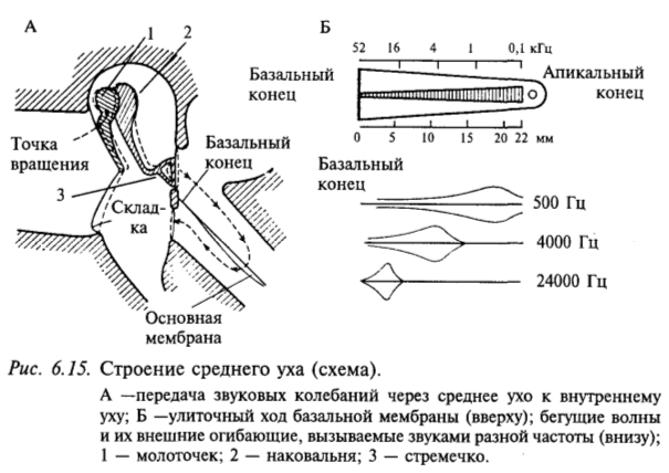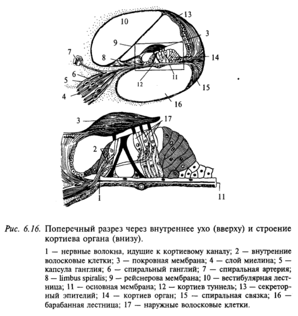 Звуковая волна действует на барабанную перепонку, и далее через систему косточек звуковое давление передается на овальное окно и воздействует на перилимфу вестибулярной лестницы (см. рис. 6.15). Поскольку жидкость несжимаема, перемещение перилимфы может передаваться через геликотрему в барабанную лестницу, а оттуда через круглое окно – обратно в полость среднего уха. Перилимфа может перемещаться и более коротким путем: рейснерова мембрана изгибается, и через среднюю лестницу давление передается на основную мембрану, затем в барабанную лестницу и через круглое окно в полость среднего уха. Именно в последнем случае раздражаются слуховые рецепторы. Колебания основной мембраны приводят к смещению волосковых клеток относительно покровной мембраны и, следовательно, к их деполяризации и далее к возбуждению волокон слухового нерва.