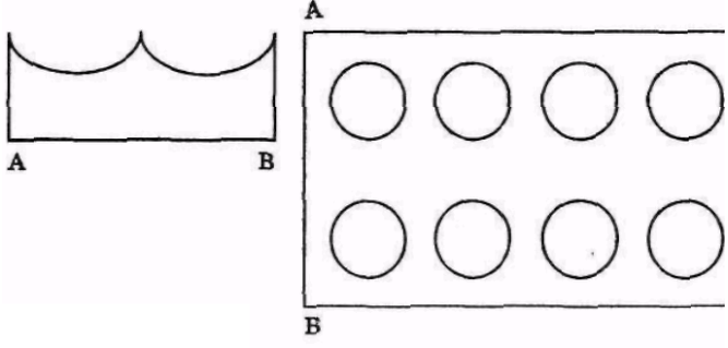 Теперь представьте, что вместо гладкого стола мы имеем поверхность с двумя желобами, как показано на рисунке 1.3. Теперь, если просто высыпать шарики на эту поверхность, они сами расположатся двумя ровными рядами на дне желобов.